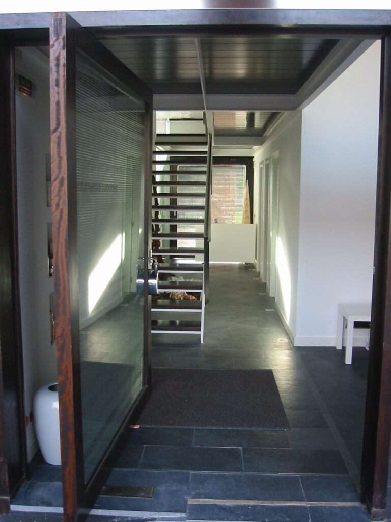 La gran puerta doble de acceso permite una visión fluida del espacio, destacando la escalera que conecta ambas plantas y asegurando una circulación cómoda para los usuarios. Este diseño abierto y funcional garantiza que cada elemento contribuya a una experiencia agradable y eficiente.