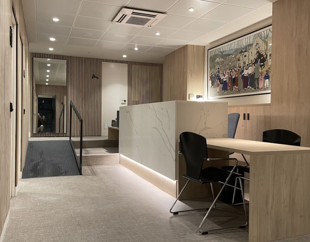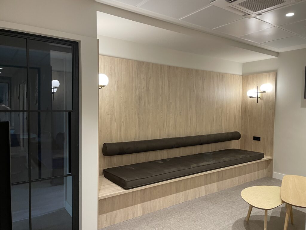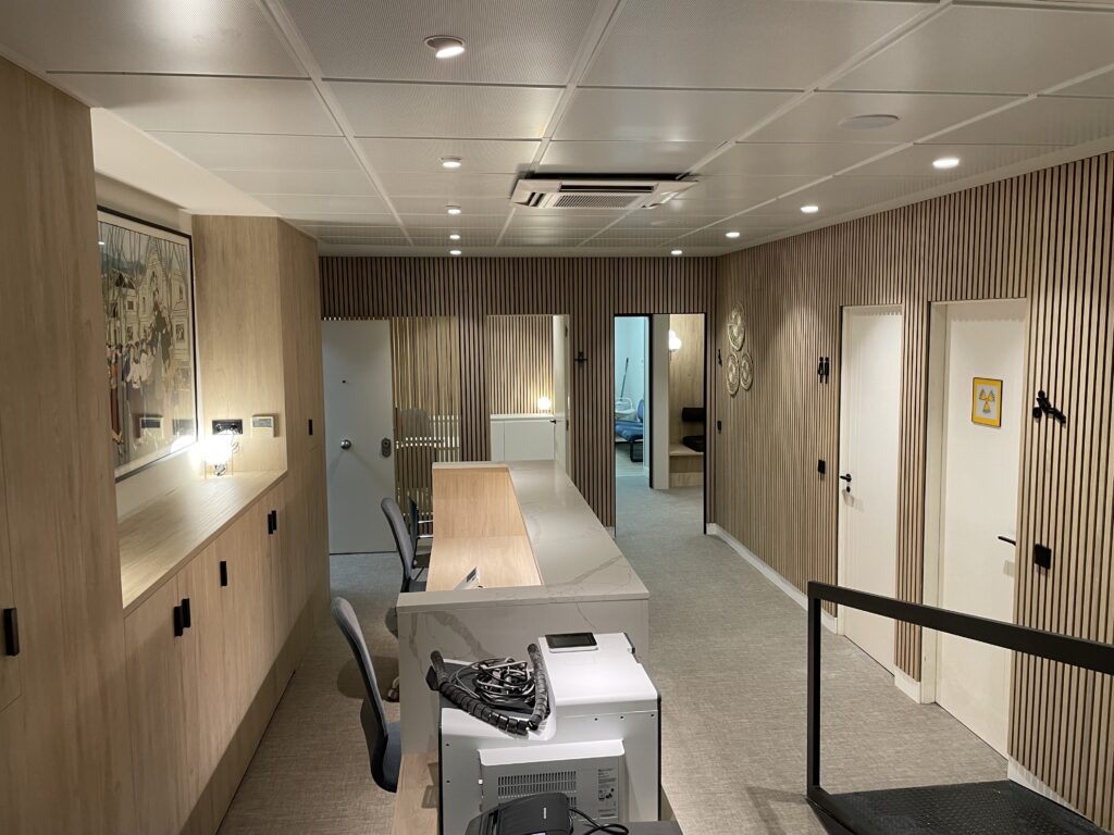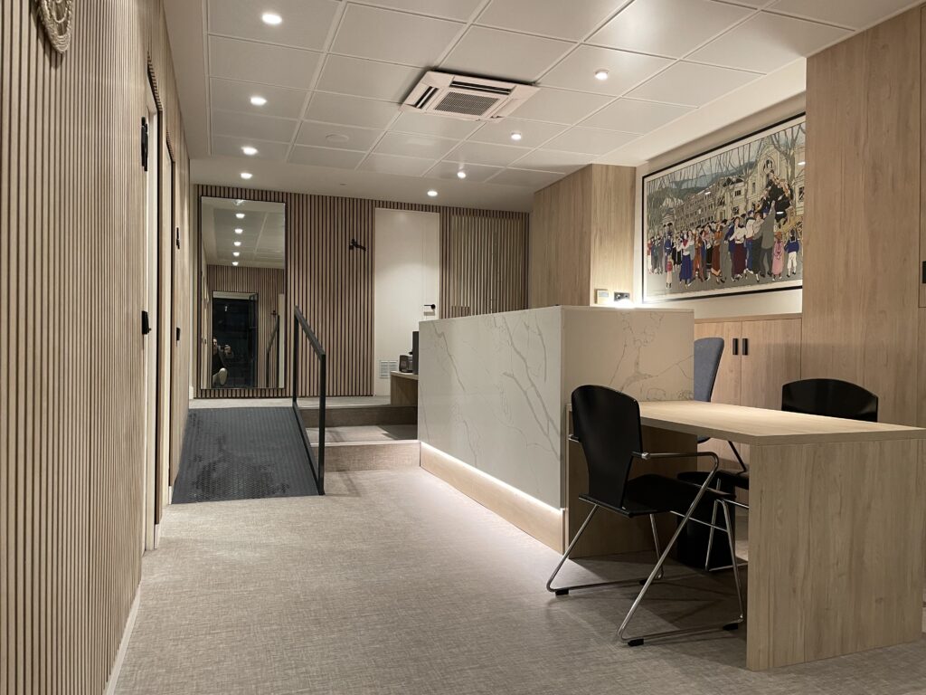 Uno de los mayores desafíos de este proyecto fue llevar a cabo la reforma afectando mínimamente al normal funcionamiento de la clínica. El gran reto fue lograr un equilibrio perfecto entre rapidez y calidad, asegurando que cada detalle del diseño y la ejecución cumpliera con los más altos estándares sin retrasos innecesarios. Solo fue necesario interrumpir la actividad de la clínica durante un periodo muy corto e inevitable, para la ejecución de trabajos concretos. Gracias a la planificación y organización precisas, esta pausa fue mínima y puntual, permitiendo que la clínica retomara su ritmo habitual de manera inmediata.