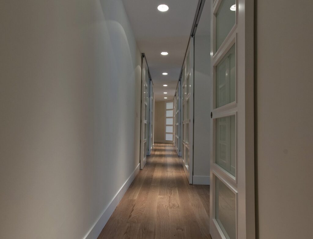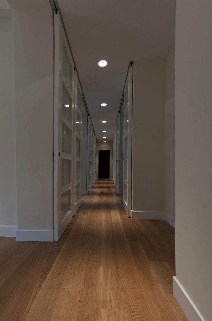 Para unificar todos los ambientes, se diseñó un pasillo central con puertas correderas vidriadas en blanco, que aportan luminosidad y continuidad. El pavimento también juega un papel clave: un suelo de roble claro de lama ancha recorre toda la vivienda, añadiendo calidez y armonía. En la cocina y los baños, se optó por un suelo cerámico oscuro, resistente y con un atractivo contraste visual.